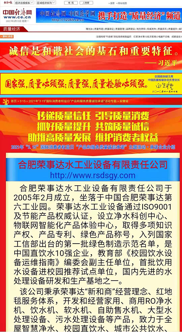 作為凈水行業(yè)領(lǐng)軍企業(yè),榮事達(dá)積極響應(yīng)中國(guó)質(zhì)量檢驗(yàn)協(xié)會(huì)“產(chǎn)品和服務(wù)質(zhì)量誠(chéng)信承諾”號(hào)召,面向廣大用戶做出相關(guān)產(chǎn)品和服務(wù)質(zhì)量誠(chéng)信承諾,體現(xiàn)了企業(yè)應(yīng)有的社會(huì)責(zé)任和擔(dān)當(dāng)。本次評(píng)選,需要對(duì)2000余家企業(yè)的誠(chéng)信、質(zhì)量情況進(jìn)行調(diào)查,并結(jié)合社會(huì)評(píng)價(jià),再由權(quán)威專家層層嚴(yán)格篩選專業(yè)審核。榮事達(dá)從中脫穎而出,一舉獲得“全國(guó)產(chǎn)品和服務(wù)質(zhì)量誠(chéng)信示范企業(yè)”“全國(guó)質(zhì)量信得過(guò)產(chǎn)品”“全國(guó)凈水行業(yè)質(zhì)量領(lǐng)先品牌” “全國(guó)質(zhì)量誠(chéng)信先進(jìn)企業(yè)”四項(xiàng)殊榮,相關(guān)承諾和獲獎(jiǎng)情況已在《中國(guó)質(zhì)量網(wǎng)》、《中國(guó)經(jīng)濟(jì)網(wǎng)》、《中國(guó)消費(fèi)網(wǎng)》在線發(fā)布。該項(xiàng)活動(dòng)也得到《人民網(wǎng)》、《新華網(wǎng)》、《光明網(wǎng)》、《新浪》、《搜狐》、《今日頭條》等主流網(wǎng)絡(luò)媒體的報(bào)道。