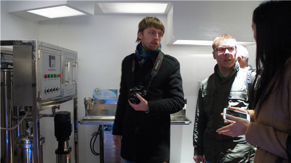 在榮事達(dá)家電研發(fā)中心二樓展廳,色彩紛呈、形態(tài)各異的凈水產(chǎn)品引得許多乘客注目凝視。出于對自動售水機(jī)的好奇,考察團(tuán)許多成員一進(jìn)門便被吸引過去,通過介紹,他們紛紛夸這個大家伙方便好用??吹骄缕恋摹懊贰⑻m、竹、菊”純水機(jī)時,兩名俄羅斯女士不禁用英語單詞“nice”表達(dá)了自己的喜愛之情。