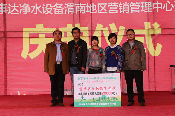 2015年1月12日,榮事達(dá)水工業(yè)公司與安徽省青年志愿者協(xié)會共同發(fā)起了一項范圍覆蓋全國的大型助殘公益行動“樂享凈水——讓快樂與生命同在”。此次活動通過向不符合“國家生活飲用水衛(wèi)生標(biāo)準(zhǔn)”的康復(fù)中心、特殊學(xué)校、助殘機(jī)構(gòu)等捐贈凈水設(shè)備以及提供志愿服務(wù),積極改善當(dāng)?shù)貧埣踩说娘嬎顮顟B(tài),以實(shí)際行動喚起社會對殘疾群體的重視與關(guān)愛。
