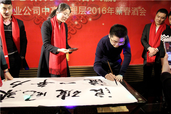 酒會(huì)上,雷鳴董事長(zhǎng)作了重要講話,向全體中高管理層成員拜年,感謝全體成員一年來(lái)為公司發(fā)展辛苦的付出與努力,并希望新的一年大家共同努力,讓公司繼續(xù)大展宏圖、欣欣向榮。之后,各分公司、事業(yè)部、部門紛紛以創(chuàng)新、幽默、多樣的方式向全體參會(huì)人員拜年。生產(chǎn)制造中心以喜慶的春聯(lián)為依托,在表達(dá)新春祝福的同時(shí),還帶來(lái)了印有“安全第一 質(zhì)量為本”字樣的員工集體簽名橫幅,為確保產(chǎn)品質(zhì)量作出承諾;凈水家電事業(yè)部總經(jīng)理王悅生的現(xiàn)場(chǎng)即興題字,用丹青妙筆表達(dá)了其部門成員奮勇?tīng)?zhēng)先的目標(biāo)和信心;工程事業(yè)部總經(jīng)理劉東帶領(lǐng)其部門成員所采用的“三句半”拜年方式贏得了滿堂喝彩;財(cái)務(wù)部與企劃部共同合作的“異口同聲”有獎(jiǎng)競(jìng)猜創(chuàng)意拜年,更是傳達(dá)了“榮事達(dá)一家親”的美好寓意。