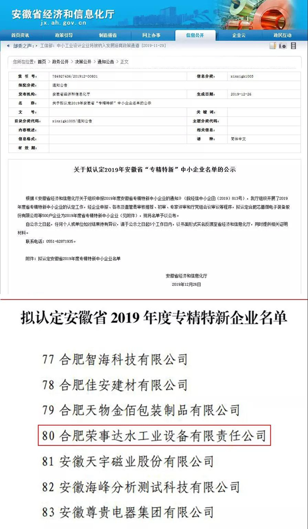 12月26日,安徽省經(jīng)濟(jì)和信息化廳公布了2019年安徽省“專精特新”企業(yè)名單,合肥榮事達(dá)水工業(yè)設(shè)備有限責(zé)任公司憑借在專業(yè)化、精細(xì)化、特色化和創(chuàng)新化方面的獨特優(yōu)勢成功入選。