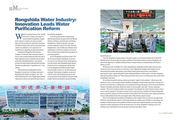 談起近年來榮事達所取得的突破,榮事達水工業(yè)公司董事長雷鳴表示:“‘一帶一路’戰(zhàn)略帶來了前所未有的機遇,也為榮事達打開了更廣闊的海外大門”。作為國家工信部首批綠色制造示范企業(yè),榮事達在政府政策大力支持下,與東南亞馬來西亞、柬埔寨,南亞印度、巴基斯坦,非洲贊比亞,南美洲智利等“一帶一路”經濟帶上多國達成合作。2019年,榮事達凈水設備貿易出口逾5700臺,同期增幅達50%。 而在對外開拓的同時,榮事達水工業(yè)公司堅持與時俱進,邀請俄羅斯、印度、韓國等各國考察團走進公司參觀交流,并與全球頂尖技術企業(yè)加強合作,積極促成商務貿易、產品功能開發(fā)、專項技術突破等發(fā)展。去年,榮事達水工業(yè)產品持續(xù)亮相世界制造業(yè)大會、中國進出口商品貿易會等國際舞臺。憑借企業(yè)在外貿領域的突出引導性,2019年榮事達成功獲評“全國凈水行業(yè)一帶一路先鋒企業(yè)”,贏得行業(yè)一致肯定。
