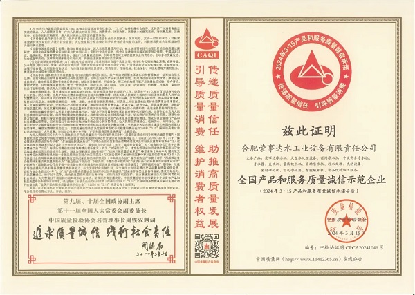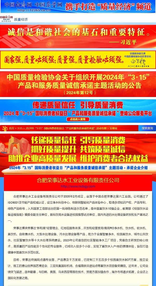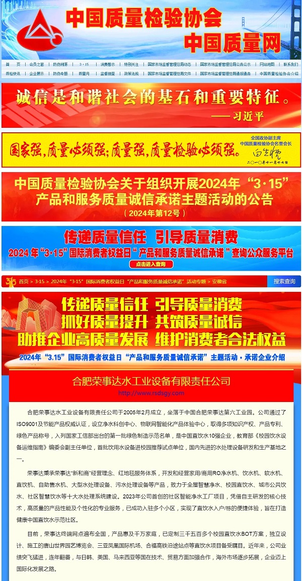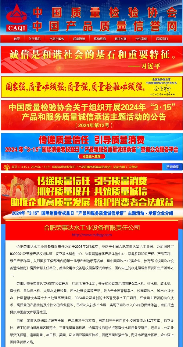 傳遞質(zhì)量信任,引導(dǎo)質(zhì)量消費(fèi)。 在由中國(guó)質(zhì)量檢驗(yàn)協(xié)會(huì)主辦的2024年“3·15”產(chǎn)品和服務(wù)質(zhì)量誠(chéng)信承諾的主題活動(dòng)中,榮事達(dá)水工業(yè)公司憑借卓越的產(chǎn)品品質(zhì)及良好的社會(huì)形象,獲得協(xié)會(huì)以及權(quán)威專(zhuān)家的一致認(rèn)可,榮膺 “全國(guó)產(chǎn)品和服務(wù)質(zhì)量誠(chéng)信示范企業(yè) ”“全國(guó)凈水行業(yè)質(zhì)量領(lǐng)先企業(yè)”“全國(guó)凈水行業(yè)質(zhì)量領(lǐng)先品牌”“全國(guó)產(chǎn)品和服務(wù)質(zhì)量誠(chéng)信品牌”“全國(guó)質(zhì)量檢驗(yàn)穩(wěn)定合格產(chǎn)品”“全國(guó)質(zhì)量檢驗(yàn)信譽(yù)保障產(chǎn)品”“全國(guó)消費(fèi)者質(zhì)量信譽(yù)保障產(chǎn)品 ”多項(xiàng)榮譽(yù)。