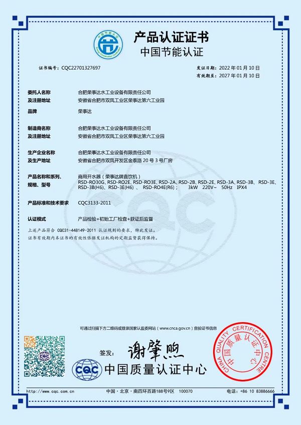 榮事達RSD-RO4E節(jié)能直飲機是中國節(jié)能認證產(chǎn)品,產(chǎn)品采用節(jié)能熱交換技術(shù),在管式交換器內(nèi),過濾后的自來水吸收開水釋放的熱能升溫85℃左右,從而充分節(jié)省了降水燒開所需的電能和時間,有效改善了傳統(tǒng)飲水機的費時、費電的弱點。設備采用二開水二溫水設計,既滿足了員工泡茶的需求,也提供了即飲的溫水選項,極大地方便了員工的日常飲水。此外,設備采用先進的RO反滲透技術(shù),有效濾除水中的泥沙、鐵銹、重金屬等雜質(zhì),出水可達直飲標準。