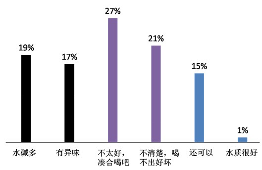 ——污染程度:六成被訪(fǎng)者對(duì)所住地區(qū)自來(lái)水的水質(zhì)表示不滿(mǎn),其中多數(shù)人的感受是“不太好,湊合喝吧”(27%),明顯感覺(jué)到“有異味”的有17%,感覺(jué)“水堿多”的為19%。對(duì)水質(zhì)表示滿(mǎn)意的人很少,占全體被訪(fǎng)者的16%,其中15%覺(jué)得“水質(zhì)還可以”,只有1%覺(jué)得“水質(zhì)很好”。