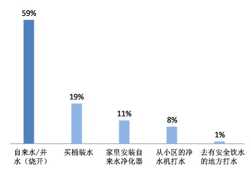 六成(59%)被訪(fǎng)者平時(shí)飲用水的最主要來(lái)源是“自來(lái)水/井水(燒開(kāi))”。也有不少人購(gòu)買(mǎi)桶裝水(19%)或是從小區(qū)凈水機(jī)打水(8%)來(lái)飲用?!凹依锇惭b自來(lái)水凈化器”的被訪(fǎng)者也不少,為11%。