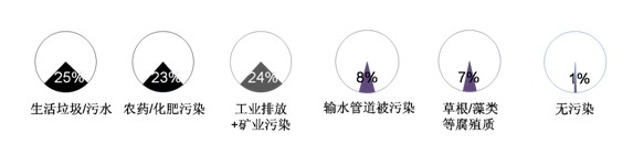 ——在農(nóng)村,近半數(shù)被訪(fǎng)者認(rèn)為危害水安全的是“生活垃圾、污水”(25%)和“農(nóng)藥、化肥”(23%),比例遠(yuǎn)超“工業(yè)排放”(16%)和“礦業(yè)污染”(8%),農(nóng)村亦存在不少“輸水管道被污染”從而污染水資源的現(xiàn)象(8%),極少數(shù)被訪(fǎng)者表示所居住的鄉(xiāng)村水資源“無(wú)污染”(1%)。