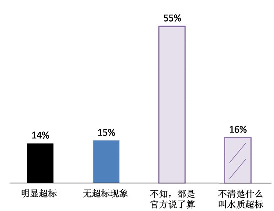 ——對(duì)于“水杯里的飲水安全”,只有不到三成的被訪(fǎng)者給了我們“明顯超標(biāo)”(14%)或“沒(méi)有超標(biāo)現(xiàn)象”(15%)的明確答案。七成被訪(fǎng)者對(duì)此一片茫然:55%被訪(fǎng)者表示“不知道,超不超標(biāo)都是官方說(shuō)了算”,16%的人甚至“不清楚什么叫水質(zhì)超標(biāo)”。
