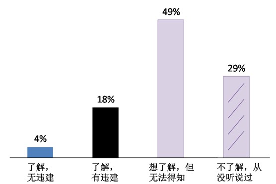 ——對(duì)“飲用水水源保護(hù)區(qū)”這一攸關(guān)群眾飲水安全和健康權(quán)的規(guī)定,只有兩成群眾表示“了解”,并明確地告訴我們“有違建項(xiàng)目”(18%)或“無(wú)違建項(xiàng)目”(4%)。八成被訪(fǎng)者對(duì)此并不知曉,29%的人“從沒(méi)聽(tīng)說(shuō)過(guò)”,也并沒(méi)有想要了解的意愿。半數(shù)(49%)被訪(fǎng)者“想了解”,但無(wú)奈于“信息不透明,無(wú)法得知”。