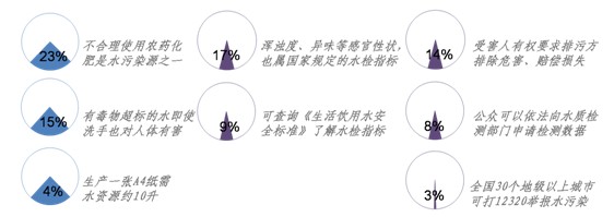 相對(duì)而言,人們對(duì)一些科普、知識(shí)性的信息認(rèn)知度較高,“過(guò)量、不合理使用化肥、農(nóng)藥是水污染源之一”已經(jīng)較為廣泛地被人們所了解(23%);不少人也清楚“汞、砷等有毒物超標(biāo)的水即使只是洗手也會(huì)對(duì)人體有害”(15%),即使是“生產(chǎn)一張A4紙所需要的水資源約10升”這樣的“冷知識(shí)”,也有一定被訪(fǎng)者有所了解(4%)。