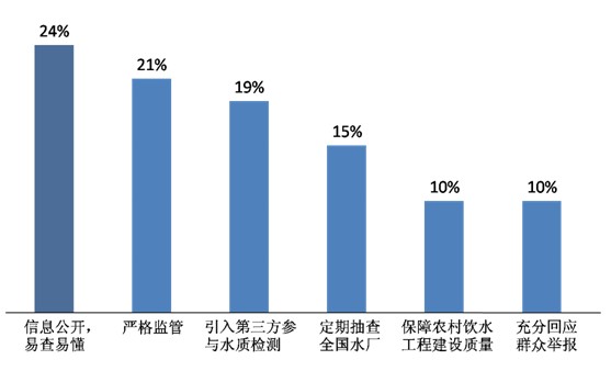 當(dāng)我們問(wèn)到“在水安全問(wèn)題上,目前最希望政府做些什么”,不少被訪(fǎng)者選擇了“依法嚴(yán)格監(jiān)管”(21%)、“引入第三方參與水質(zhì)檢測(cè)”(19%)、“定期對(duì)全國(guó)的水廠(chǎng)進(jìn)行抽查”(15%)和“保障農(nóng)村飲水工程建設(shè)質(zhì)量”(10%)。